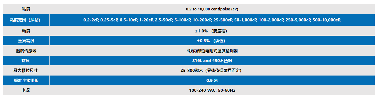 可在12個重疊的20:1粘度范圍內進行測量。粘度可顯示為厘泊(cP)或厘斯托克斯(cSt),溫度可顯示為攝氏度(℉)或華氏度(℃)。
