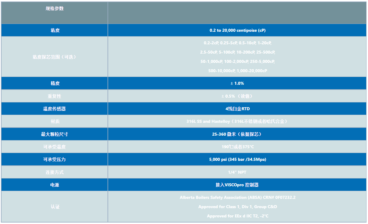 能夠在0.2-20000CP或等量CST的粘度范圍內,進行13種不同粘度范圍的測量。 探頭頭部的最大流速為10英尺/秒(3米/秒)。